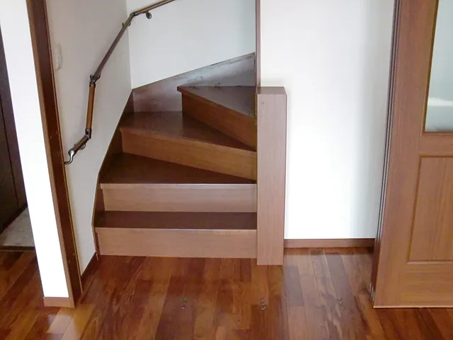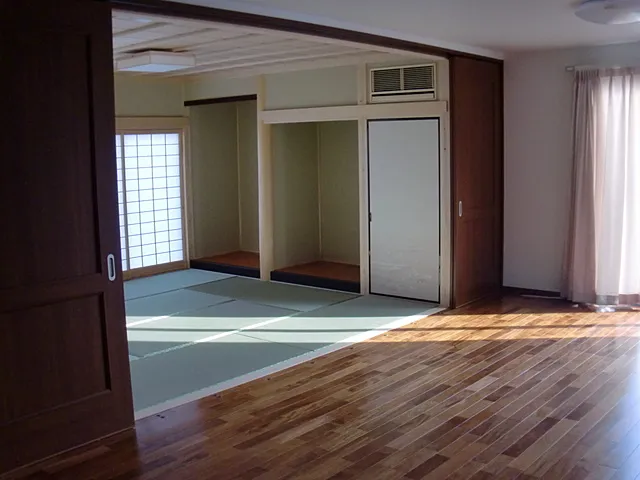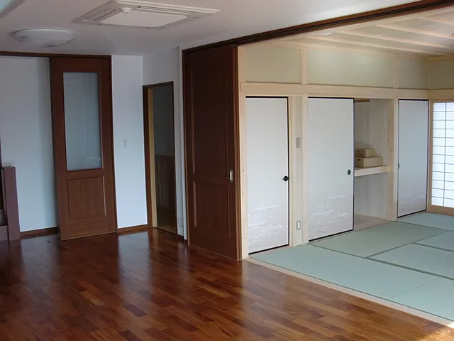 【プランニングのポイント】 長期優良住宅として建築しました。 詳しい説明はこちら。 ・リビング階段となっていますが、階段とリビングを引き戸で区切っている為、エアコン効率を損ねること無く生活できるようにしました。 ・リビングと和室をフルオープンで使えるようにした結果、約30帖分の空間を確保できるようにしました。 開口部の開き戸は標準よりも大きいタイプを使用。